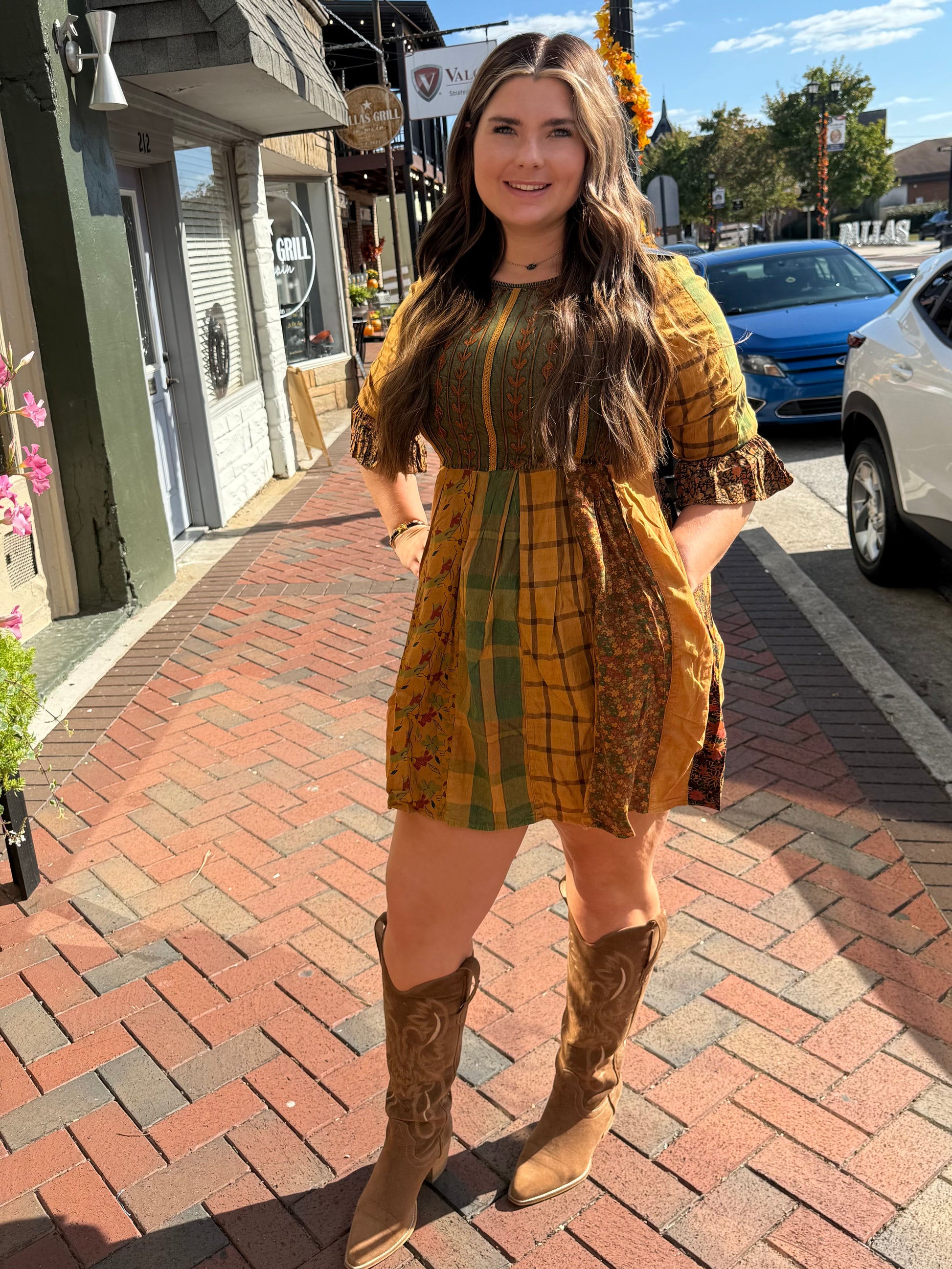 This patchwork mini dress is giving major autumn vibes with its warm mustard tones, mixed prints, and flowy fit. Pair it with your favorite cowboy boots for the perfect downtown stroll or fall festival look!